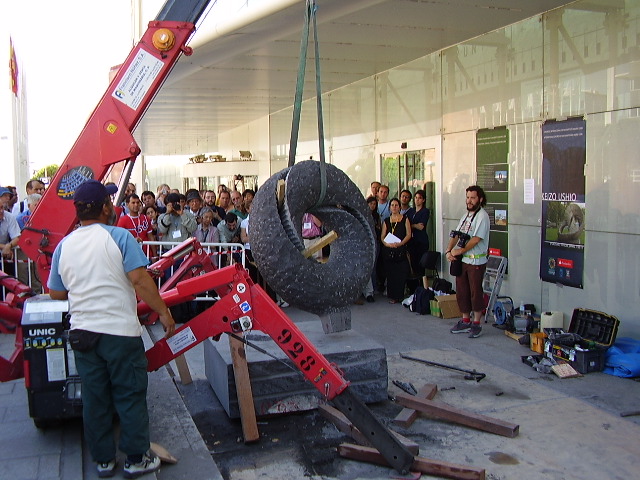 Keizo Ushio , escultor japonés junto al toro de granito que transformaría en cuatro cintas de Moebius.